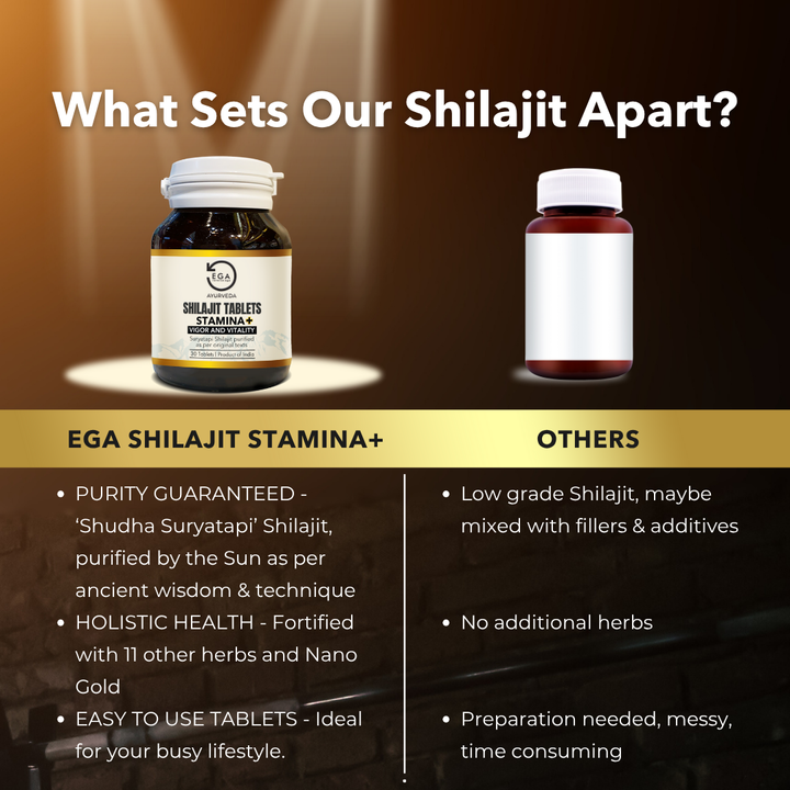 Ans: EGA Shilajit is unique due to its ancient purification process, "Suryatapi Vidhi," where raw Shilajit is sun-dried and purified over 90 days to extract the most potent properties. This ensures the highest quality and maximum health benefits, combined with other rejuvenating herbs like Suvarna, Ashwagandha, and Guduchi to enhance its effectiveness.